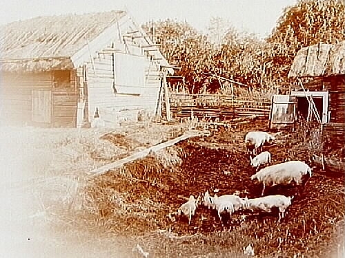 7 svin och svinstia. 2 st ålderdomliga ekonomibyggnader, knuttimrade, med vasstak.