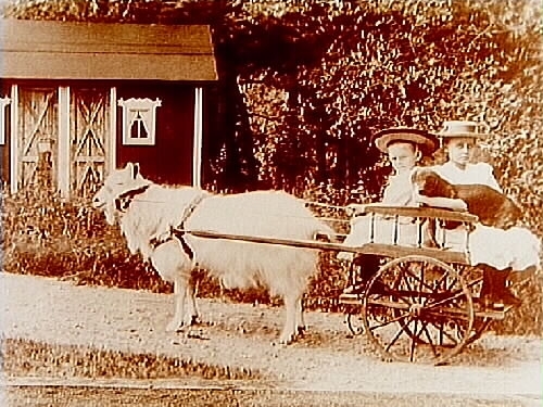 Sörby säteri, lekstuga. Lekande barn. Två barn och en hund åker i en gigg dragen av en get.