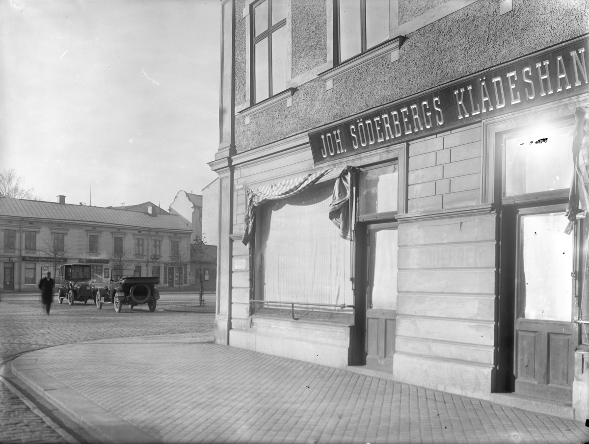 Tvåvånings bostadshus med affärslokaler i bottenvåningen, Joh. Söderbergs Klädeshandel.