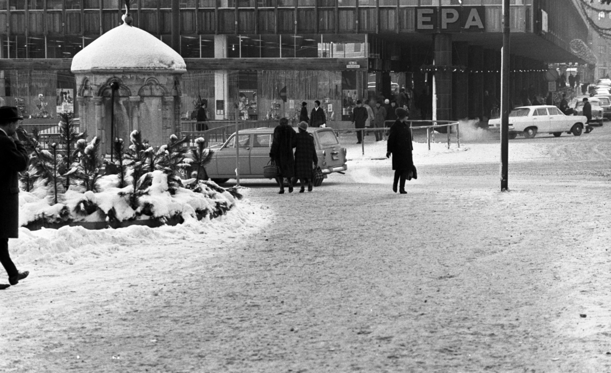 Det är en vinterdag på Våghustorget i Örebro. Två äldre kvinnor håller varandra under armarna och är på väg över vägen åt Krämaren till. Pumphuset syns till vänster på bilden. Kvinnorna står med ryggen mot kameran. En bil kör förbi framför dem. En annan kvinna kommer gående med framsidan mot kameranl. Till vänster syns en man. Bilar och ytterligare personer syns vid Krämaren. På Krämarhuset syns en skylt med texten "EPA." Över gatan uppe i luften hänger juldekorationer.