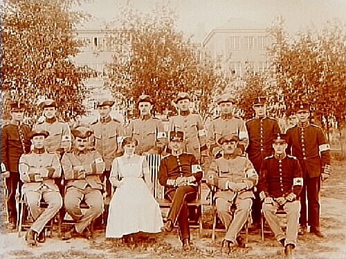 Sjukhuset i bakgrunden, 13 sjukvårdare och en sjuksköterska.