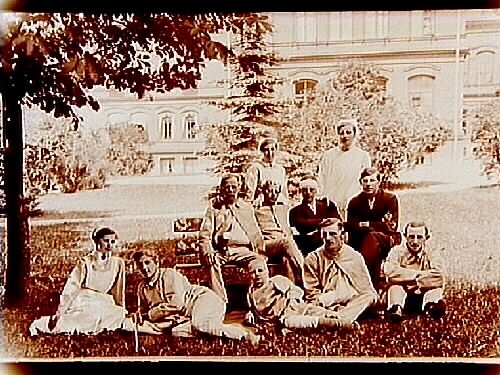 Patienter och personal i sjukhusparken.