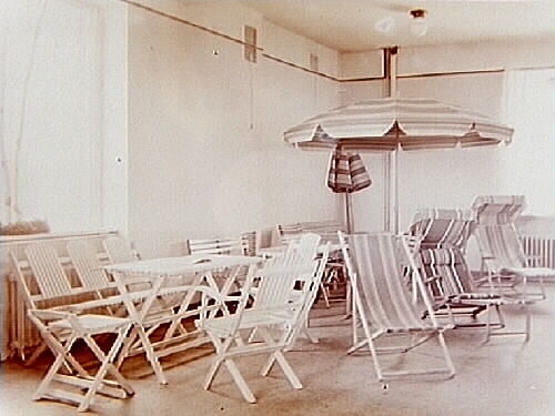 Konsum, affärsinteriör, kontorsmöbler och solstolar.