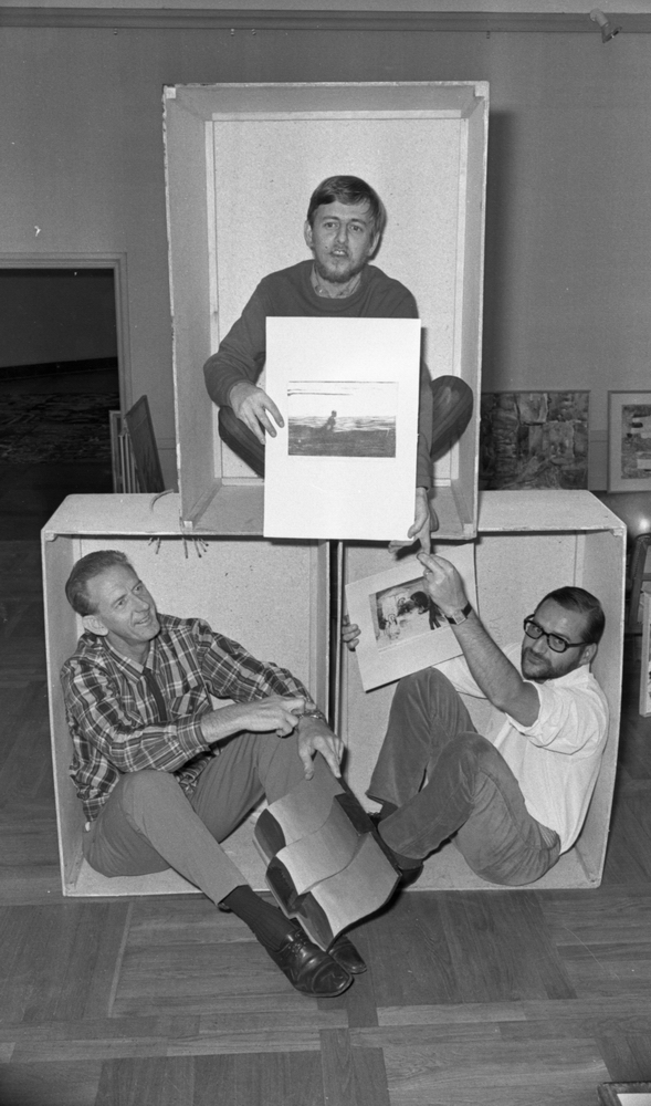 Tre vita lådor varav en står staplad ovanpå de två andra. Lådorna innehåller varsin man som håller i ett konstverk. Mannen högst upp håller i en tavla och är klädd i en ljus, långärmad tröja och ett par ljusa byxor. Mannen snett ner till vänster håller i en skulptur och är klädd i en ljusrutig skjorta, svart slips, ljusa byxor, svarta strumpor och svarta skor. Mannen till höger i en tavla och är klädd i vit skjorta, ljusa byxor samt bär glasögon.