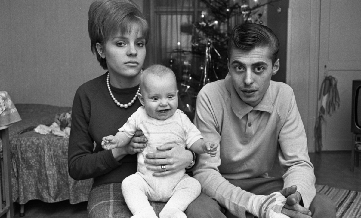 På bilden i förgrunden syns mamman med sitt barn i famnen och pappan bredvid. Pappan har sin högra hand lindad i bandage. En julgran syns i bakgrunden.