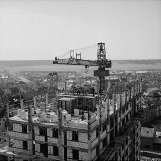 Stadsvy, byggnadsarbete i förgrunden.