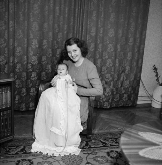 Rumsinteriör, en kvinna och ett litet barn. Barndop.