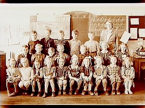 Olaus Petriskolan, klassrumsinteriör, 22 skolbarn med lärarinna fröken Edla Andersson, klass 2b, sal 17.