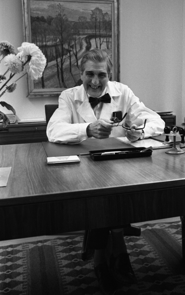 En läkare på lungkliniken sitter vid bordet inne på sitt kontor och håller sina glasögon i händerna. Han är klädd i en vit läkarrock, vit skjorta och svart fluga. En blomvas står med en blomma till vänster i på en liten duk på bordet. Bakom doktorn hänger en tavla på väggen.