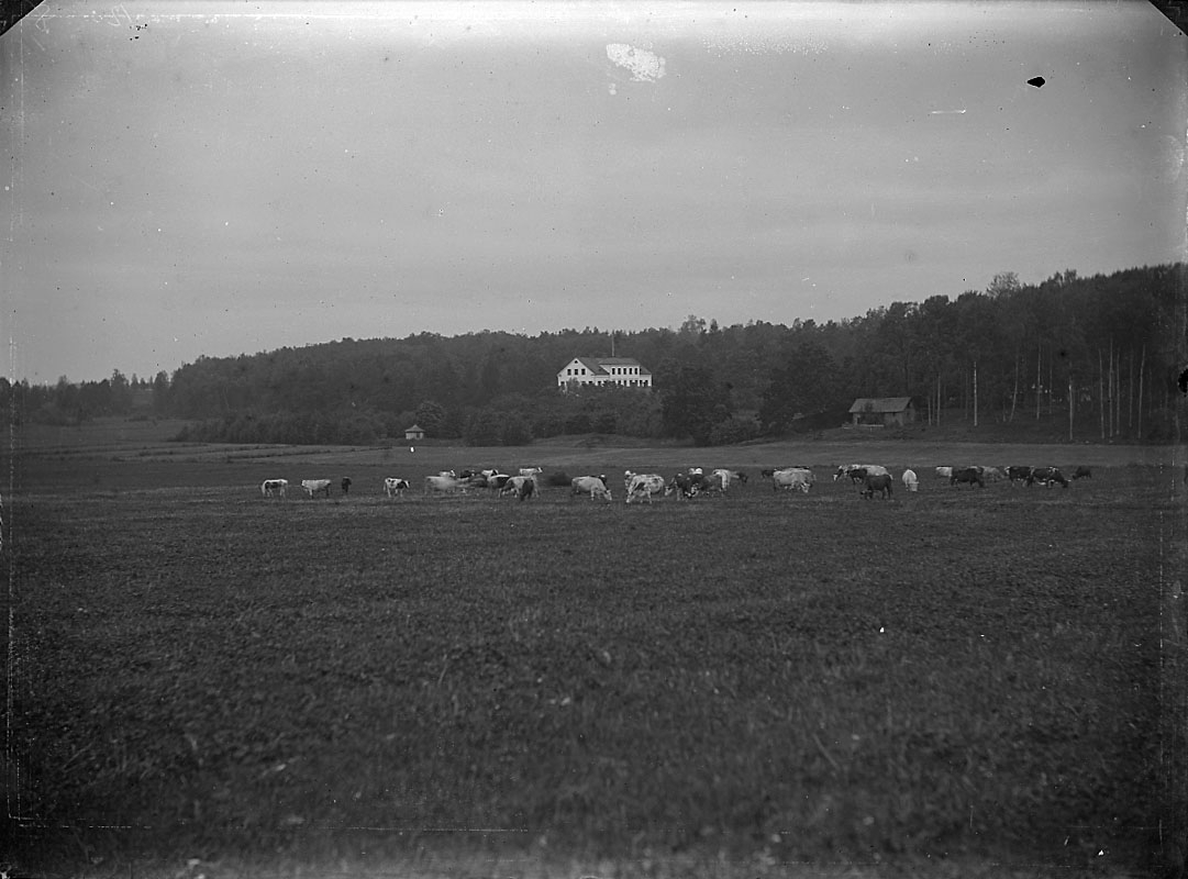 Utsikt, herrgårdsbyggnad, betande kor på ängen.