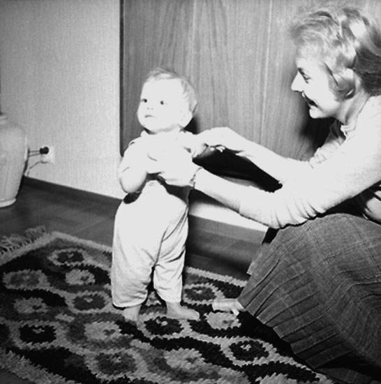 Rumsinteriör, en kvinna och ett litet barn.