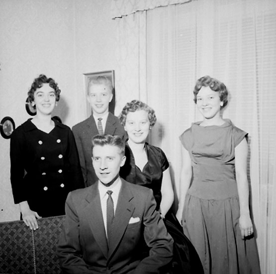 Rumsinteriör, familjegrupp 5 personer, högtid.