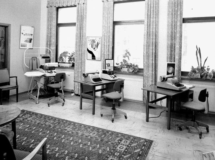 Rumsinteriör, utställning av skrivmaskiner, kontorsmaskiner och möbler.