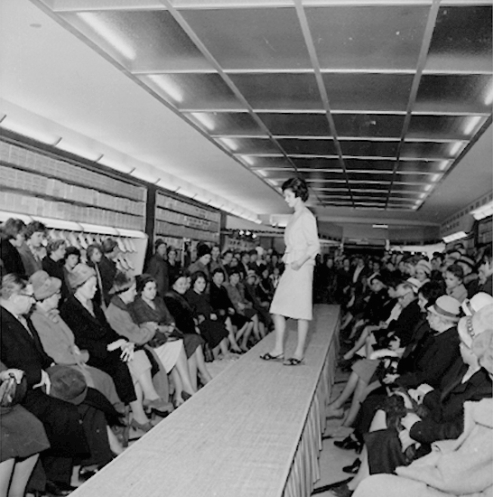 Oscarias nya affär, skoaffärsinteriör, modevisning.
