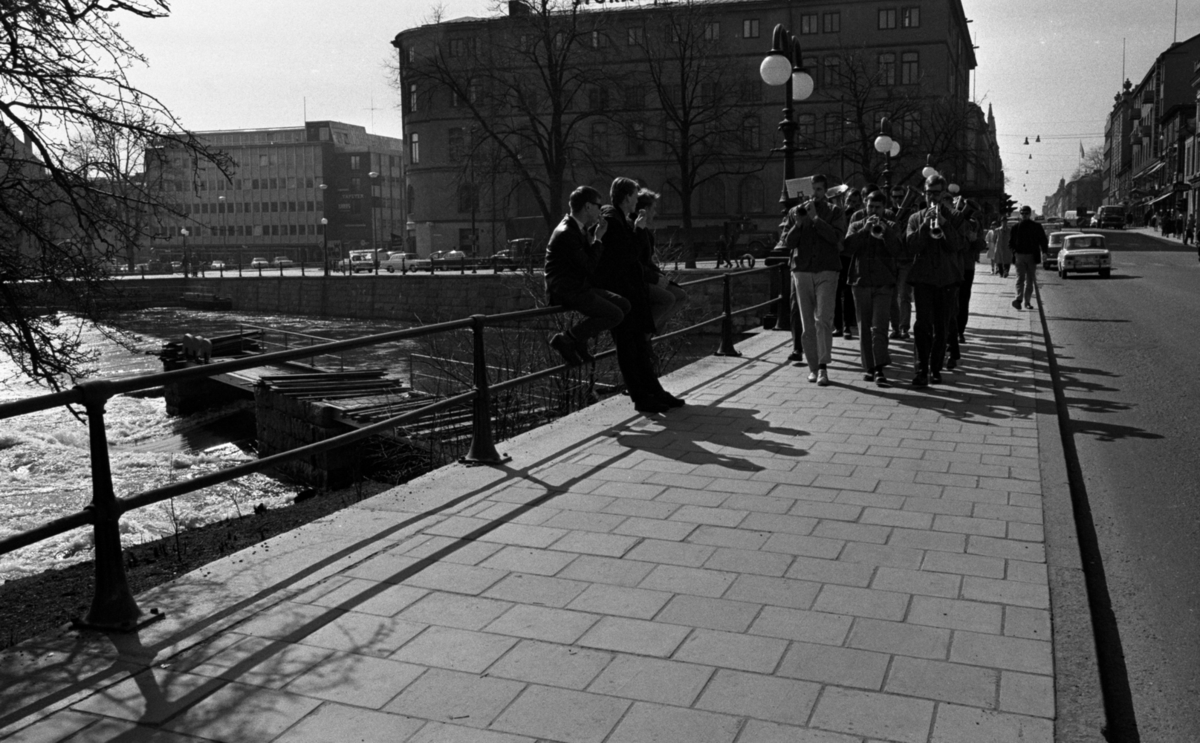 En mässingsorkester går Drottninggatan fram och spelar. Två unga män sitter och en står vid broräcket till vänster på bilden. I bakgrunden syns andra personer, byggnader samt bilar.