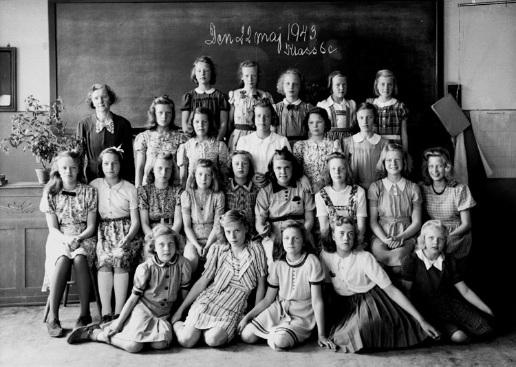 Vasaskolan, klassrumsinteriör, 24 flickor med lärarinna Aina Ahnmark.