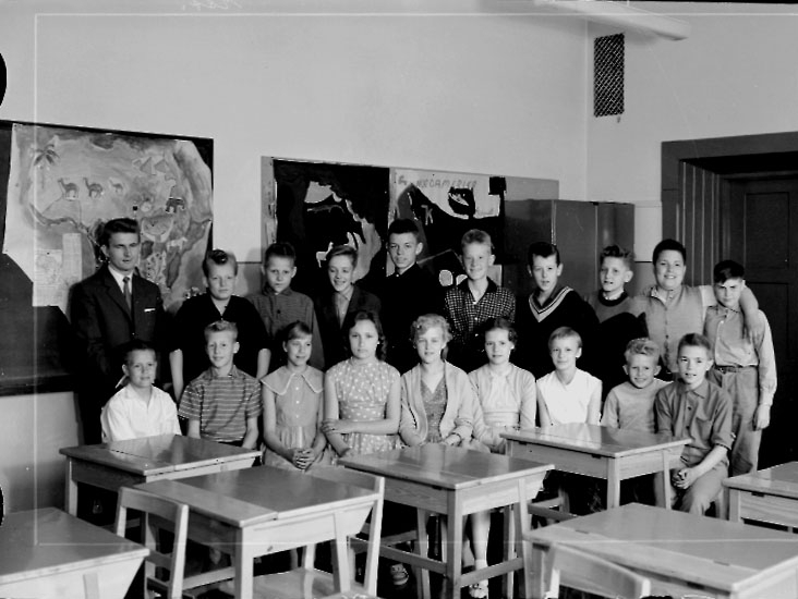 Olaus Petriskolan, klassrumsinteriör, 18 skolbarn med lärare Bengt Andersson.