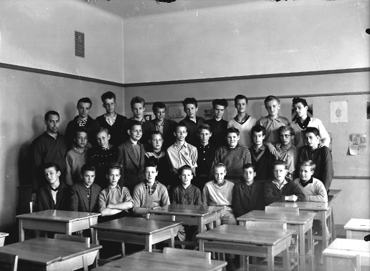 Engelbrektsskolan, klassrumsinteriör, 28 pojkar med lärare Sven Lagerlöf.