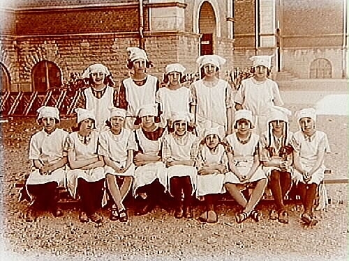 Norra Folkskolan, 14 skolflickor, skolköket. Skolbyggnad i bakgrunden.