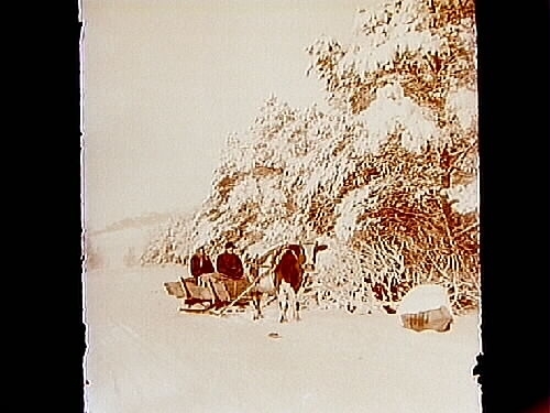 Oxe spänd för släde med två personer i, på hemväg från torget i Örebro.