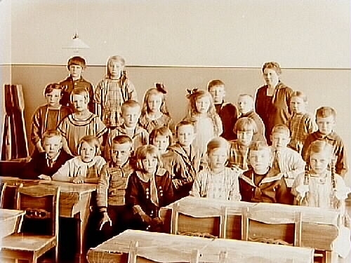 Norra skolan, klassrumsinteriör, 22 skolbarn med lärare, klass 2b, sal 7.