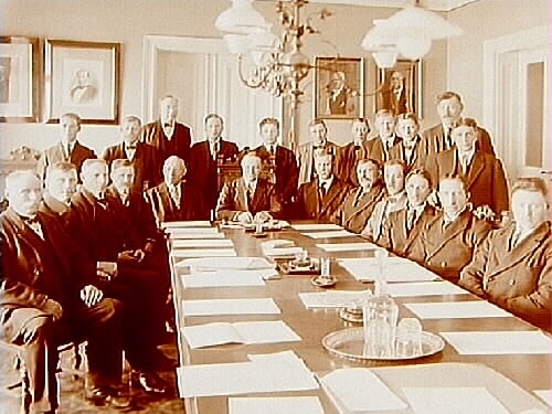 Interiör, 23 herrar runt ett bord, dikningsförmän.