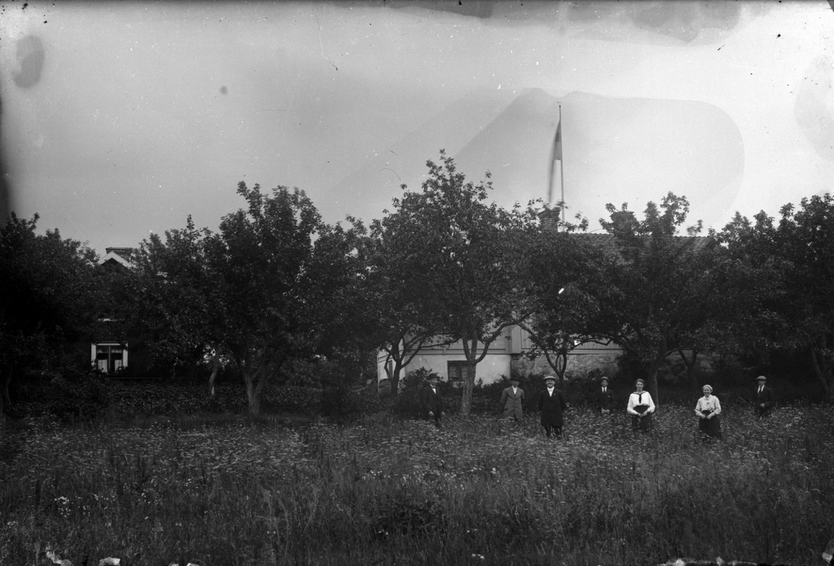 Familjegrupp sju personer i trädgården. Bostadshus i bakgrunden.