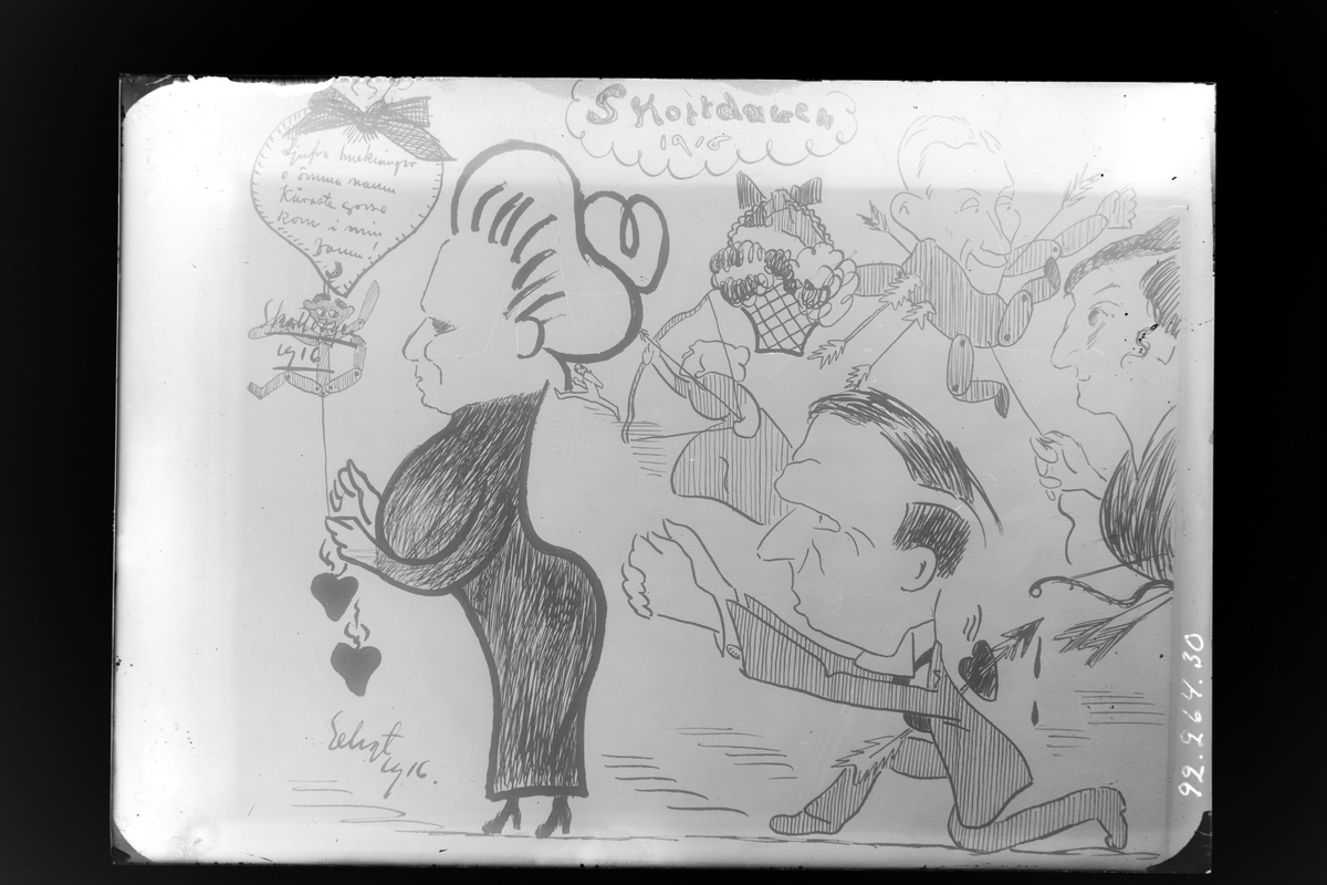 Hålhults sanatorium, interiör, karikatyrteckning, från skottdagen 1916