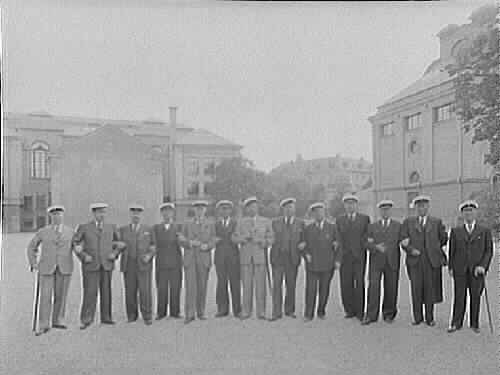 Karolinska läroverket, kamratmöte, 13 herrar på skolgården och på skolmuseét.