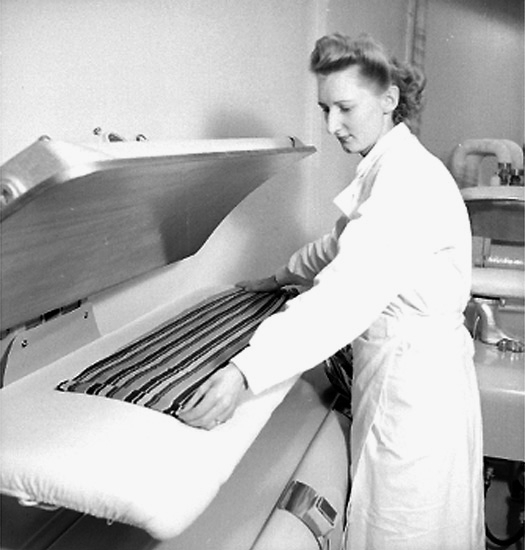 Titel: Konsums herrtvätt, interiör, en kvinna.