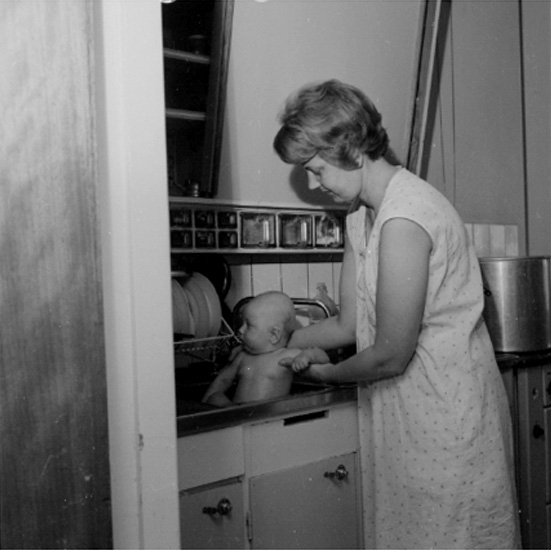 Rumsinteriör, en liten pojke som badar i diskhon, en kvinna.