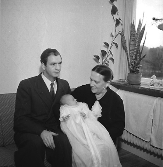 Rumsinteriör, familjegrupp tre personer, barndop.