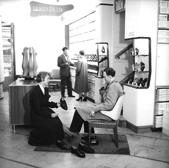 Oscaria, affärsinteriör, skoprovning, fyra personer.