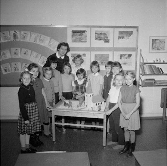 Hagaskolan, klassrumsinteriör, skolbarn med lärarinna.