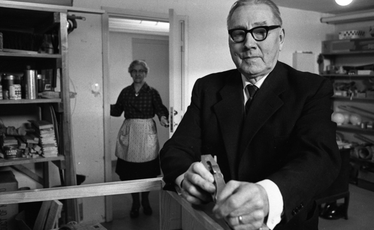Gammal man i finkostym håller på med träarbete, och det står en gammal dam i dörröppningen.