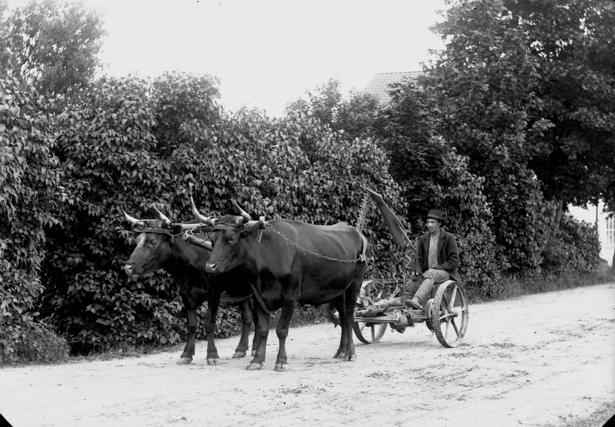 Det är troligen Albin Andersson i Hulta med oxar och en slåttermaskin. Han var ogift och hade en bror som hette Kalle. Kalle hade en fosterson som hette Olle.