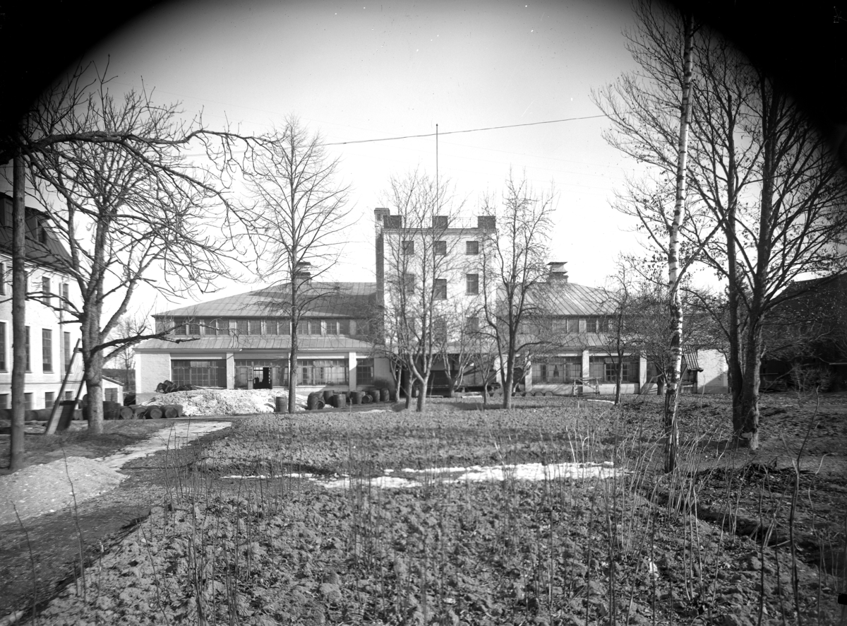 Tvåvånings fabriksbyggnad med ett torn på tre våningar, Lindbacka Läderfabrik och Kvarn.