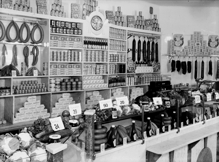 Konsum, affärsinteriör, charkuteri, grönsaker, m.m.