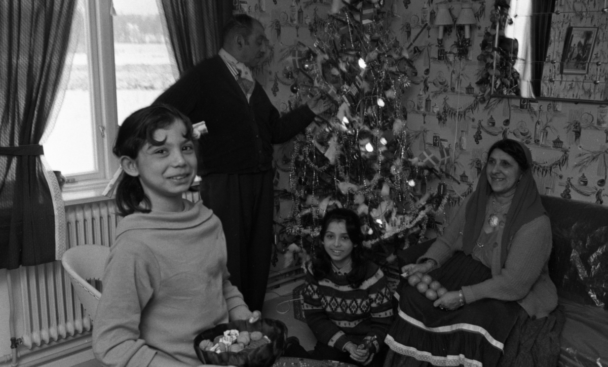 Familjen Karasko bestående av mor, far och två döttrar firar jul. De är en romsk familj. Modern är klädd i traditionell romsk dräkt. De befinner sig i sitt vardagsrum. Far i huset står upp och håller sin vänstra hand på den dekorerade julgranen. Modern sitter i soffan med en nätförpackning med frukt i knät. På golvet sitter den ena dottern med en nötknäckare i handen. Den andra dottern sitter närmast kameran med en skål fylld med nötter och andra godsaker.
