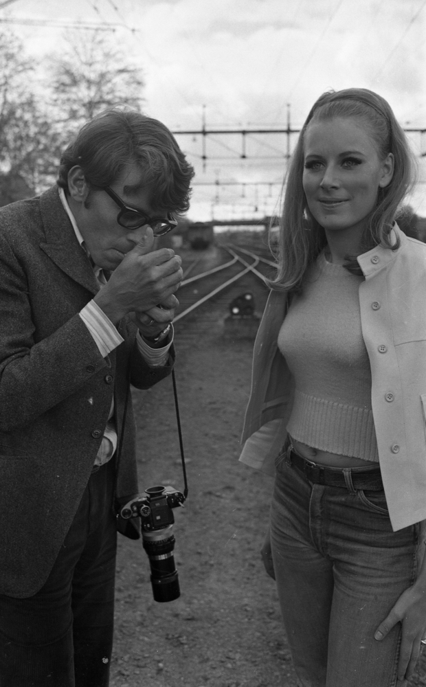 En fotomodell som är Miss Sverige klädd i vit blus med en vit jacka över och jeans med skärp i midjan samt har ett svart hårband i håret står bredvid en fotograf som har en kamera hängande i ett snöre från vänstra armen. Han är i färd med att tända en cigarrett och är klädd i ljusbrun kavaj, ljusbruna byxor, vitrandig skjorta och har glasögon på sig. De står nära järnvägsspår som syns i bildens bakgrund.