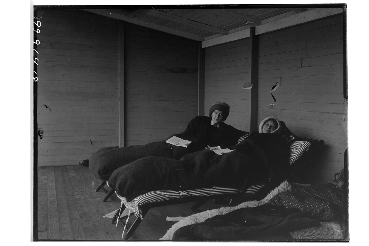 Hålhults sanatorium, exteriör, två kvinnor i en skogshall, liggande