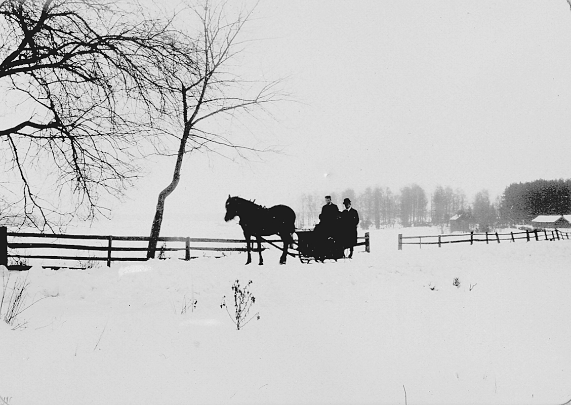 Vintermotiv, häst spänd för vagn, fyra personer i vagnen.