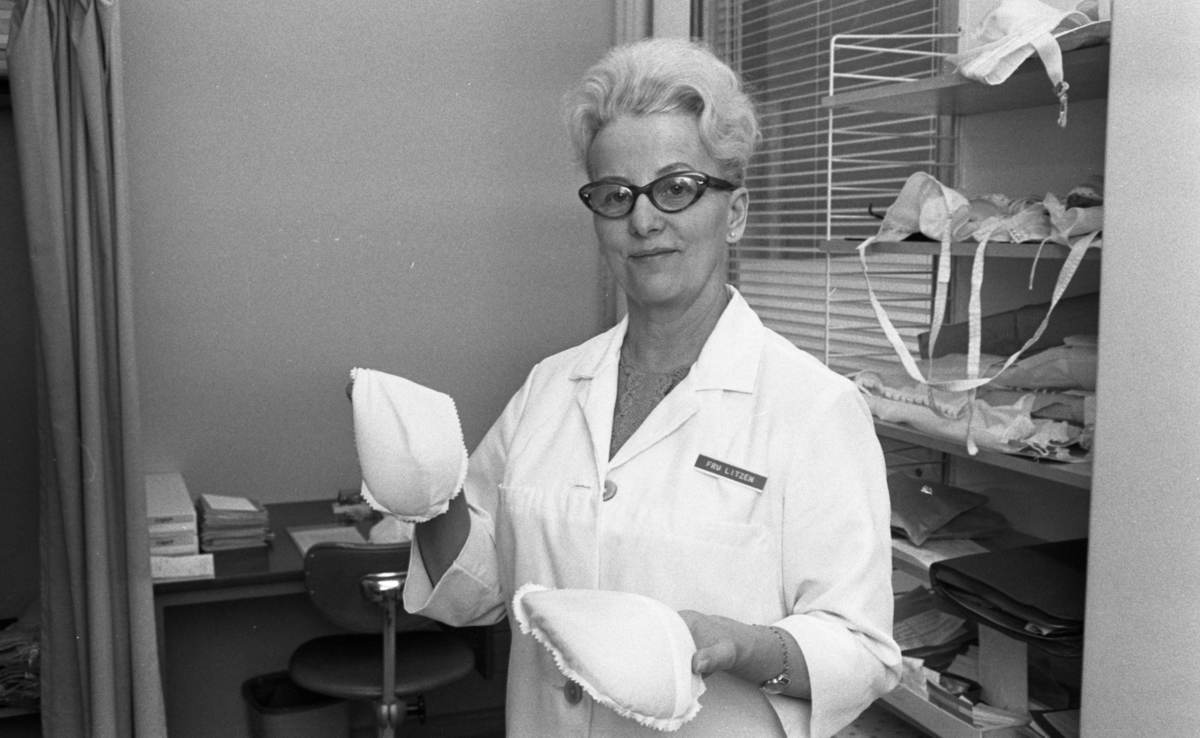 I förgrunden syns det fru Litzen. Hon är klädd i en vit rock med namnbricka ´FRU LITZEN'. Under den vita rocken bär hon en virkad tröja. Fru Litzen har ett armbandsur på sin vänstra handled. Hon bär glasögon och örhänge. Fru Litzen håller proteser i form av bystkuddar i sina händer.