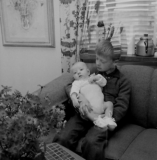 Rumsinteriör, två barn i soffan.