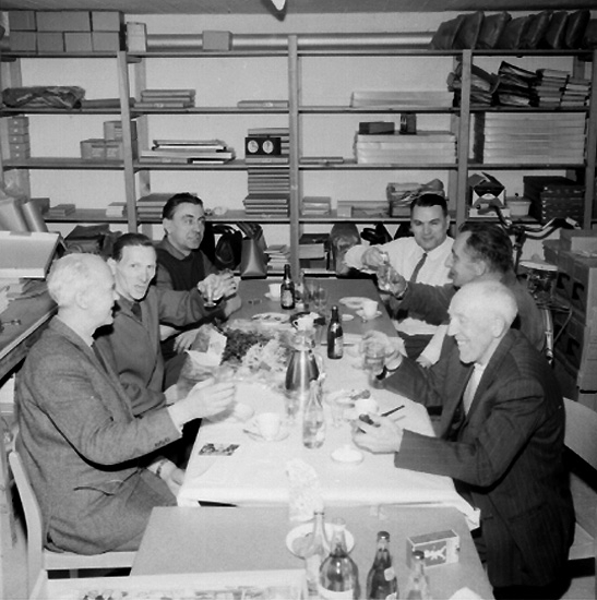 Rumsinteriör, grupp vid bordet, Kexens pensionärer. Personalklubben uppvaktar.