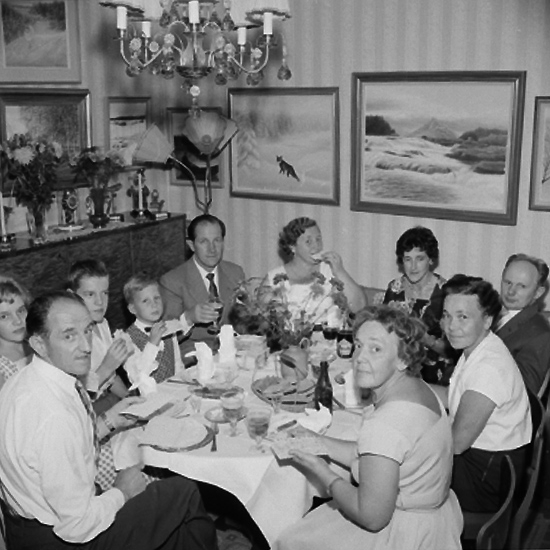 Rumsinteriör, släktgrupp, födelsedagsfirande.