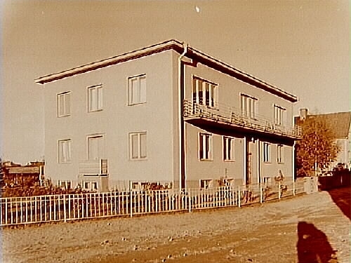Tvåvånings bostadshus med balkong.