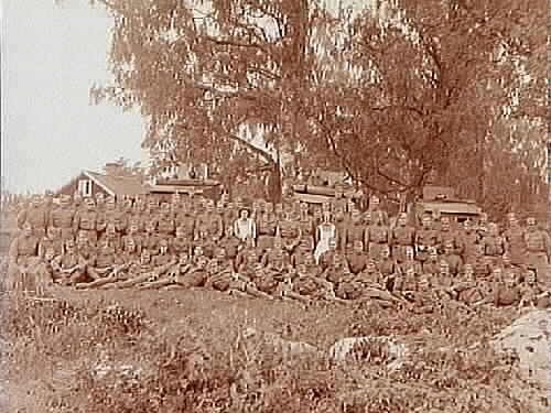I bakgrunden två bepansrade kulsprutevagnar och en kanon.