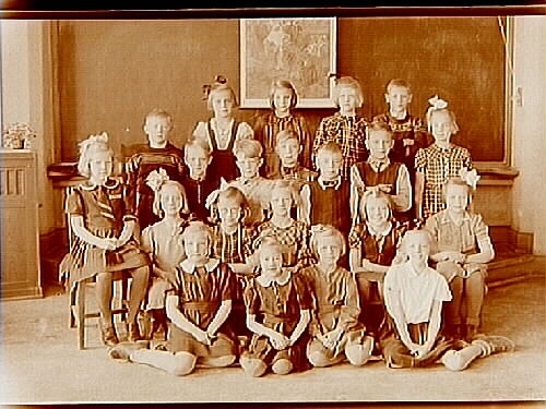 Engelbrektsskolan, klassrumsinteriör, 21 skolbarn med lärarinna fröken Emmy Söderlund, klass 2, sal 16.
