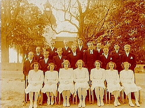 18 konfirmander, 7 flickor, 11 pojkar och kyrkoherde Gabriel Carlsten.